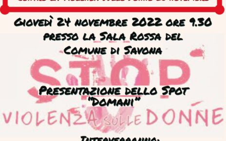 In occasione del 25 novembre, “Giornata internazionale contro la violenza sulle donne”,la Camera del Lavoro di Savona- Belle Ciao per la parità di genere, il Coordinamento donne Spi Savona (sindacato pensionati italiani) e l’Osservatorio Parità di Genere dell’Auser, presenteranno lo Spot “Domani”, breve video che pone al centro del dibattito lo sguardo degli altri su […]