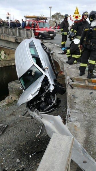 Cogoleto. Un uomo, per cause da accertare, ha perso il controllo della propria auto sfondando il guardrail su un viadotto basso ed è rimasto sospeso sul torrente sottostante. E’ accaduto questo pomeriggio sulla Via Aurelia tra i comuni di Arenzano e Cogoleto davanti allo stadio “Gambino”. Sul posto sono intervenuti i vigili del fuoco che hanno estratto il conducente dall’abitacolo affidandolo ai soccorritori. L’auto è stata sollevata da un autogru.