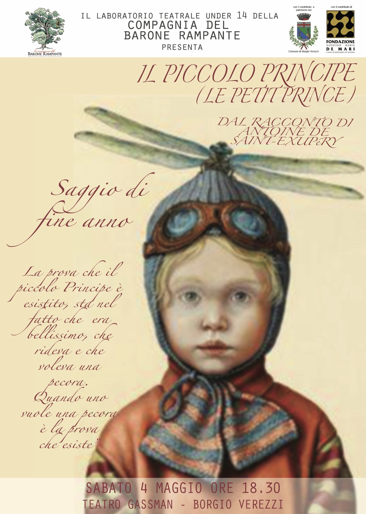 Borgio Verezzi. Sabato 4 Maggio alle 18.30 al Teatro Gassman di Borgio Verezzi, il laboratorio teatrale under 14 della Compagnia del Barone Rampante presenta “Il piccolo principe” (Le Petit Prince) saggio di fine anno dal racconto di Antoine de Saint-Exupéry.