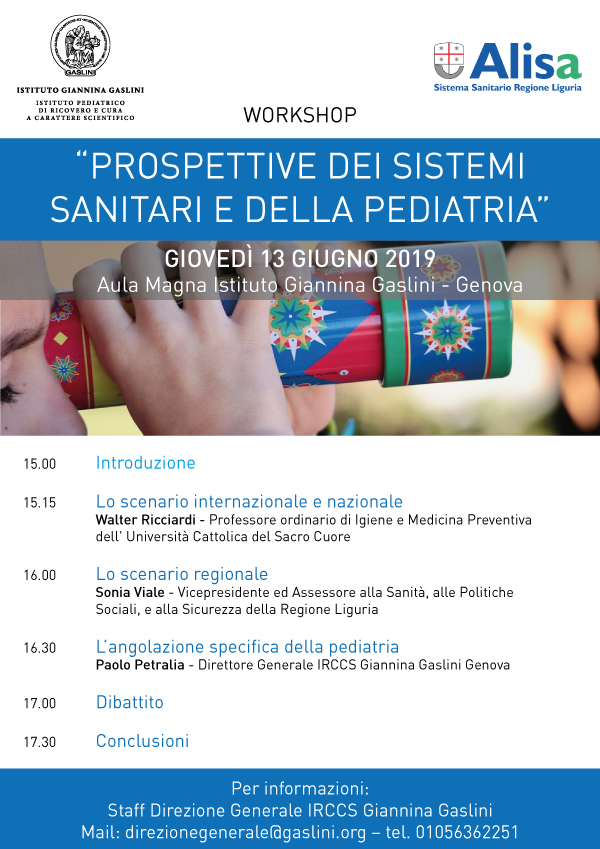 Domani, giovedì 13 Giugno, a partire dalle 15.00 l’Aula Magna (pad.16 piano terra) dell’ospedale pediatrico Giannina Gaslini ospiterà il Workshop “Prospettive dei sistemi sanitari e della Pediatria”.