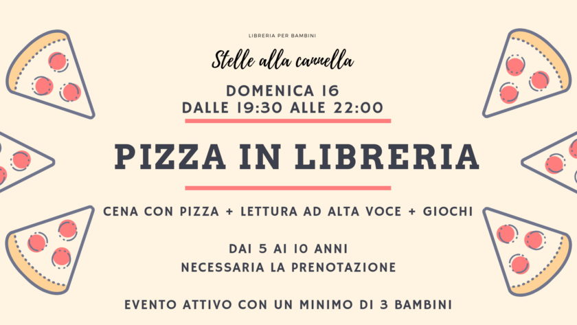 Domenica 16 giugno dalle 19:30 alle 22:00 – “Pizza in libreria“: Mamme e papà in libreria c’è una novità! Vi piacerebbe poter fare una cena romantica o con gli amici in totale relax? Non vi preoccupate ci pensa la libreria a Stelle alla Cannella. Da questa settimana la libreria offre un nuovo servizio: Intrattenimento per bambini dalle 19:00 alle 22:00 con cena, giochi e tante storie! Voi genitori dovete solo pensare a rilassarvi.
