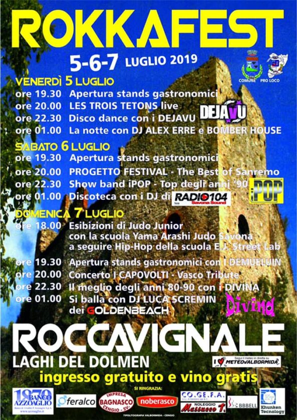 Siamo alla vigilia dell’edizione 2019 di Rokkafest. Tre giorni di musica sul palco galleggiante, divertimento e buon cibo nel suggestivo scenario dei laghetti Dolmen a Roccavignale. Le date da segnarsi sull’agenda sono il primo weekend di Luglio: 5-6-7. Radio104 Savona Sound sarà media partner dell’evento con dirette dalla location valbormidese. Nei giorni scorsi ultima riunione con gli organizzatori e il Sindaco Amedeo Fracchia.