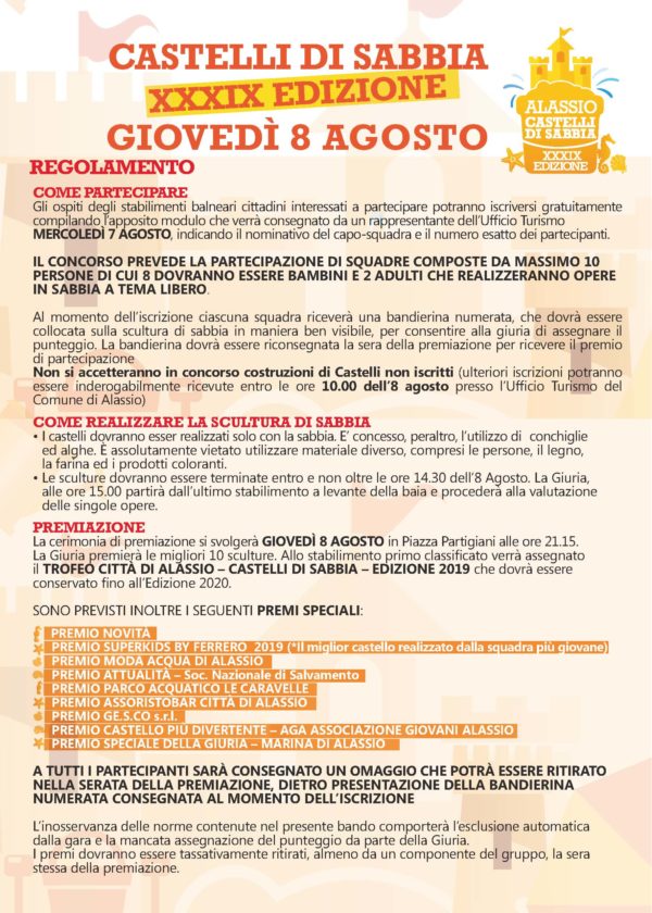 Così tutti al via al mattino di giovedì 8 agosto, sull’arenile alassino per dare forma e vita alla sabbia. I castelli dovranno infatti essere realizzati di sola sabbia con l’ausilio per le decorazioni solo di “prodotti” del mare: conchiglie ed alghe.