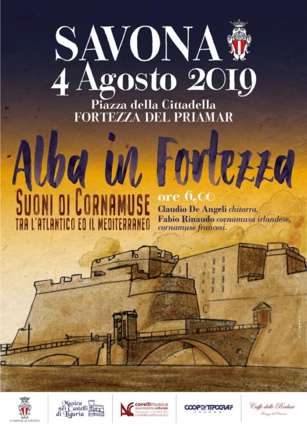 Alba in fortezza a Savona. Domenica alle 6 il Priamar ospita il concerto “Suoni di Cornamuse tra l’Atlantico e il Mediterraneo”. Fabio Rinaudo alle cornamuse irlandesi e francesi insieme alla chitarra di Claudio de Angeli apriranno la giornata con un suggestivo spettacolo.