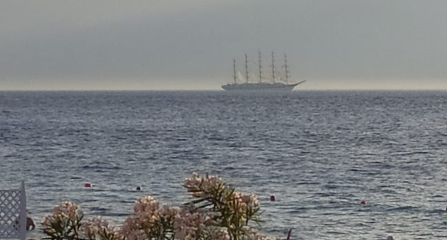 Ha costeggiato la riviera savonese prima di entrare in Darsena a Savona. Si tratta della nave da crociera “Royal Clipper”: 134 metri di lunghezza, 5 alberi e 42 vele, ha una capacità di 227 passeggeri e durante la stagione estiva solca il Mediterraneo.