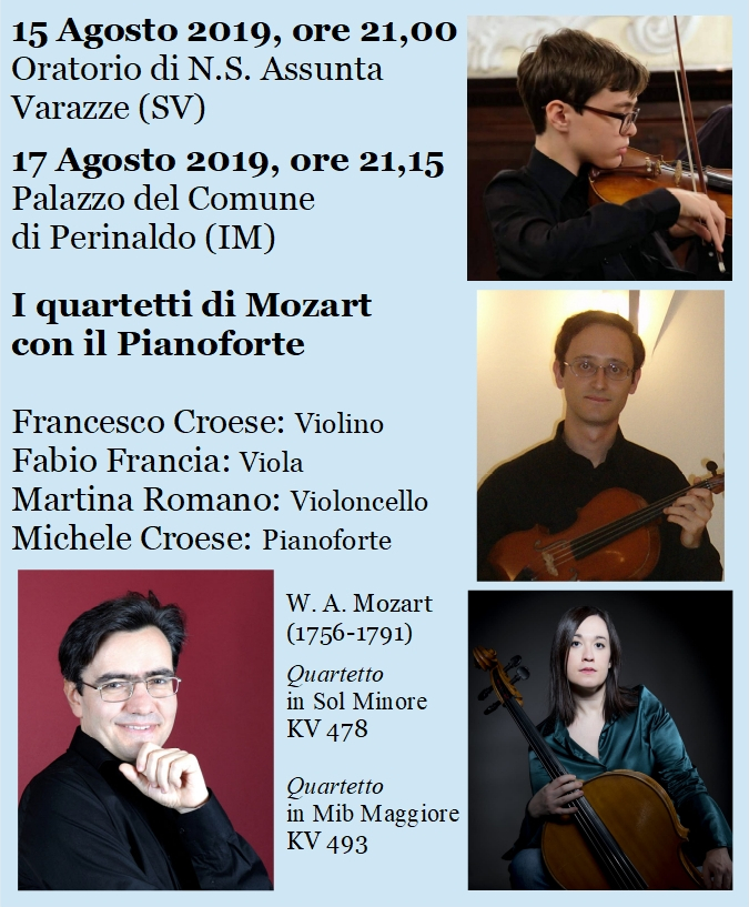 Varazze. Il secondo appuntamento della rassegna musicale internazionale “Al lume delle stelle“, in programma alle ore 21:00 di giovedì 15 agosto 2019, nell’Oratorio N.S. Assunta di Varazze, che quest’anno prevede l’esecuzione dei quartetti di Mozart, eseguiti con un pianoforte storico del 1800 da Michele Croese, con il giovanissimo violinista Francesco Croese, Fabio Francia alla viola e Martina Romano al violoncello.