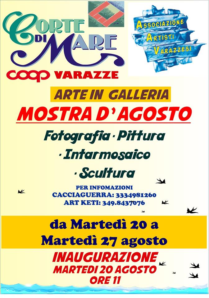 Varazze. Martedì 20 agosto alle 11:00, a Varazze, presso il Centro Commerciale “Corte di Mare”, di via Montegrappa 43, si terrà l’inaugurazione della Mostra d’Agosto di Fotografia, Pittura, Intarmosaico e Scultura, che coinvolge i soci del noto gruppo artistico varazzino, responsabile della “Gallery Malocello” di via Malocello n.37, organizzata dall’Associazione Artisti Varazzesi.