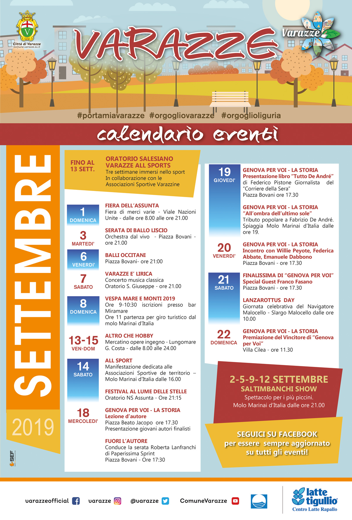 Varazze. Varazze svela il calendario per il mese di settembre: dalla manifestazione dedicata alle Associazioni Sportive “All Sport”, all’ultimo appuntamento con la rassegna Varazze è Lirica, al Lanzarottus Day e al concorso nazionale per scoprire giovani autori di canzoni “Genova per Voi” che, dal 18 al 22 settembre, porterà a Varazze ospiti quali: Franco Fasano, autore di successi come Mi manchi (Fausto Leali), Ti lascerò (Fausto Leali/Anna Oxa), Regalami un sorriso (Drupi) ma anche di canzoni per lo Zecchino d’Oro (Goccia dopo goccia, Katalicammello…) e sigle di cartoni animati (Piccoli problemi di cuore, Pesca la tua carta Sakura, Rossana…); Willie Peyote, rapper vincitore del talent Genova Per Voi che, con il suo album La sindrome di Tôret ha conquistato la Top 10 dei dischi più venduti in Italia; Federica Abbate che vince il talent nel 2013 e ottiene in premio un contratto come autrice per Universal Music Publishing, scrive per Eros Ramazzotti, Loredana Berté, Giusy Ferreri, Alessandra Amoroso, Boomdabash, Marracash, Benji e Fede, Francesca Michielin e tanti altri; Emanuele Dabbono, cantautore noto al grande pubblico per la partecipazione nel 2008 alla prima edizione di X Factor e, più recentemente,