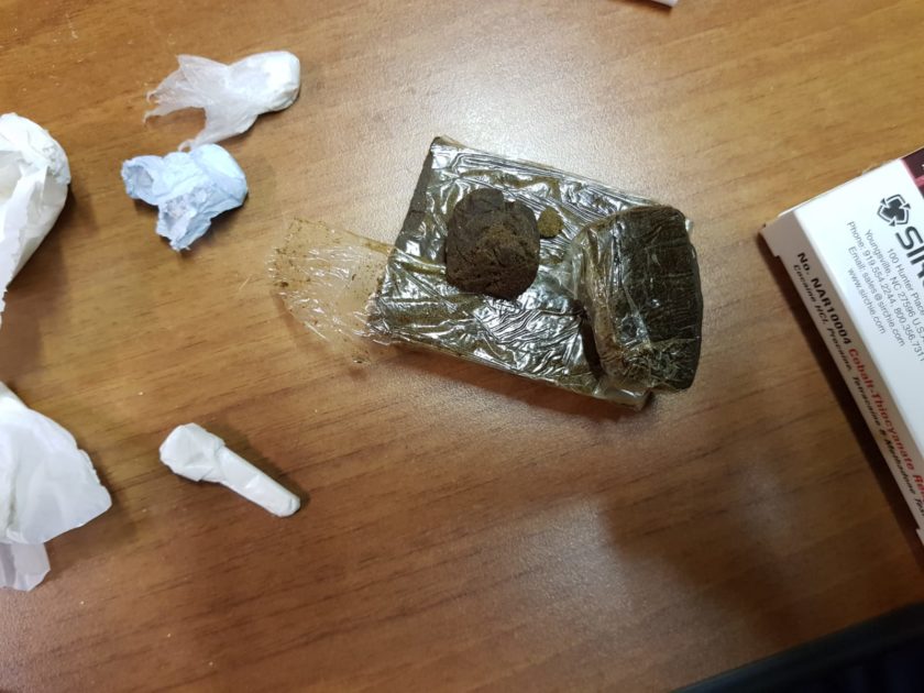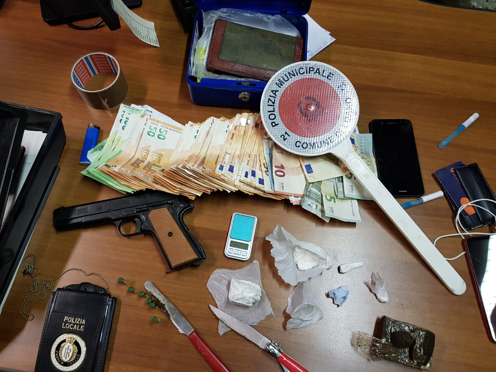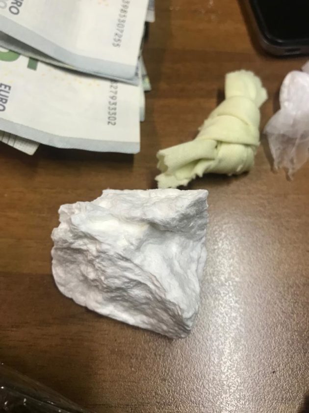 Dopo essere stato ammanettato l’uomo ha dato cenni di nervosismo e ha tentato la fuga. A questo punto gli agenti hanno deciso di effettuare una perquisizione nella sua abitazione: qui hanno ritrovato circa mezzo etto di cocaina e circa un etto di hashish oltre a 4.900 euro in contanti, un bilancino di precisione, due coltelli usati per il taglio della sostanza e tutto l’occorrente per il confezionamento della merce, telefoni cellulari usati e ricevuti in cambio di alcune cessione di droga, nonché una pistola “scacciacani” con sei munizioni a salve.
