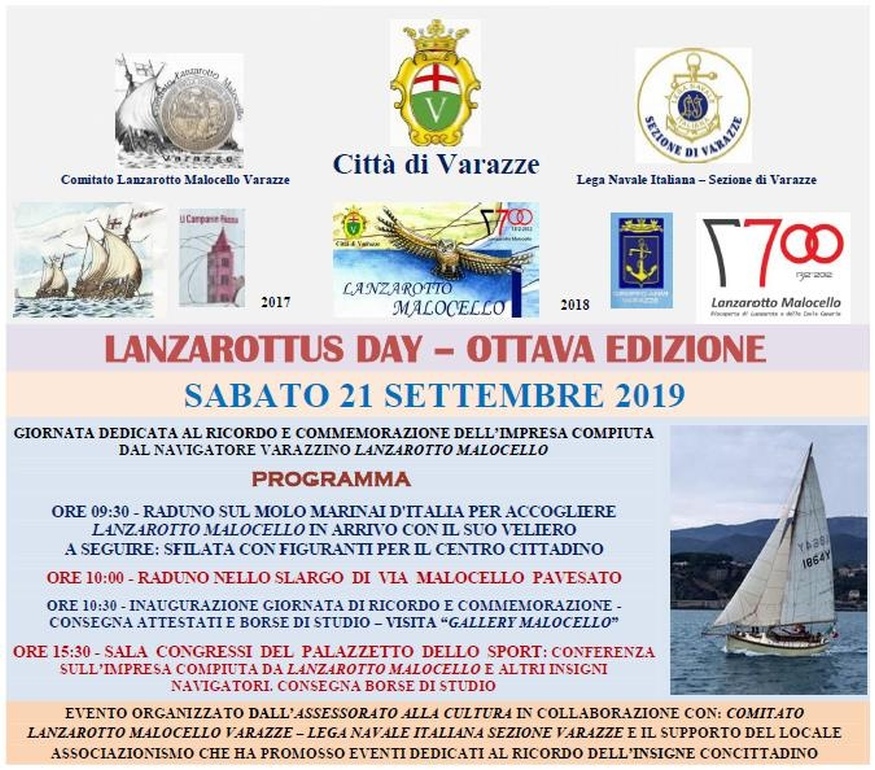 Varazze. Sabato 21 settembre 2019 si terrà l’ottava edizione del “Lanzarottus Day“, organizzata dall’Assessorato alla Cultura della città di Varazze in collaborazione con il locale Comitato Lanzarotto Malocello: una giornata, una settimana, un anno dedicati al ricordo dell’impresa compiuta da Lanzarotto Malocello, con la partecipazione e il coinvolgimento del locale associazionismo, delle Scuole di ogni ordine e grado, di personalità della cultura, dello sport e del turismo provenienti da varie località.