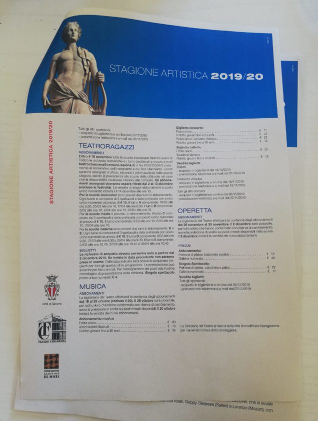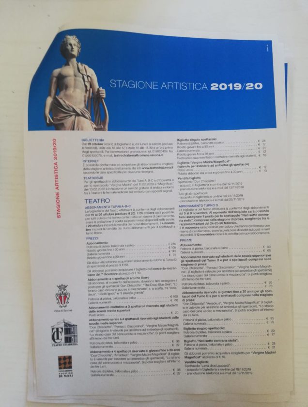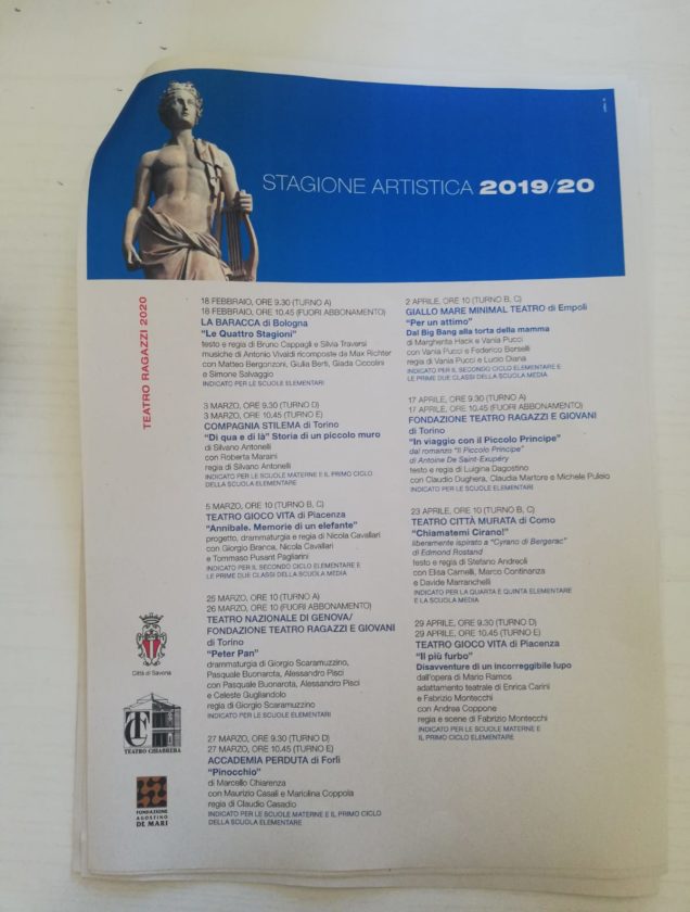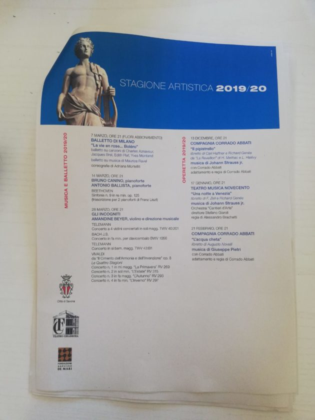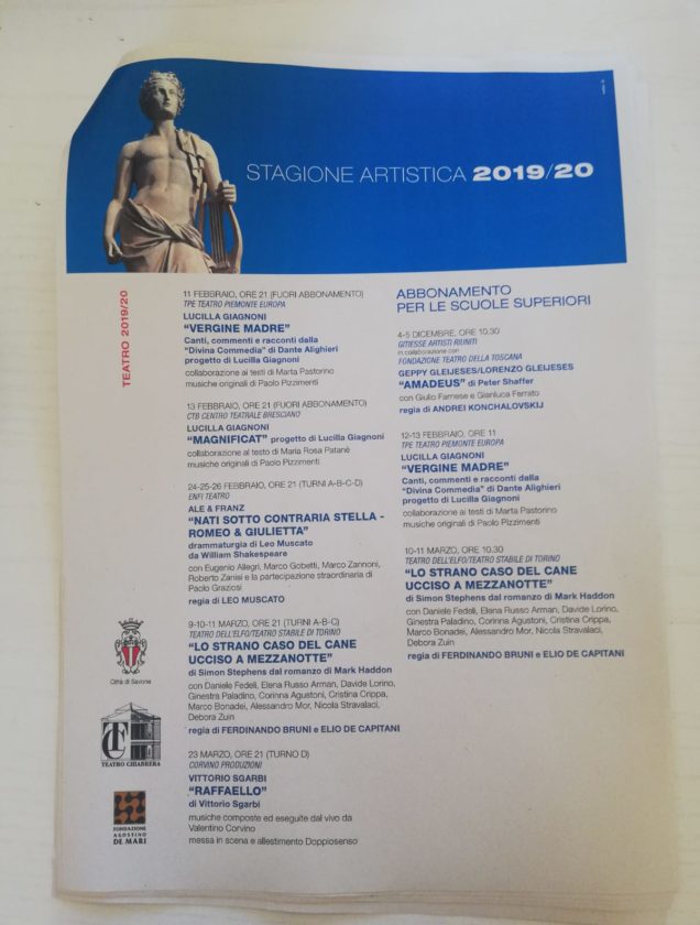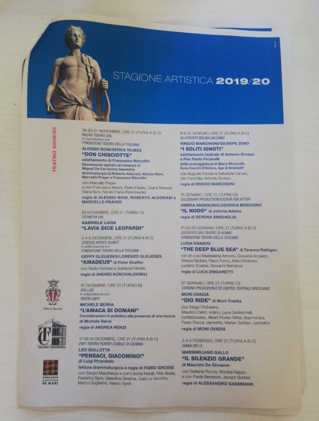 Ancora una volta la stagione del Teatro Chiabrera offre una programmazione di alto profilo, presentando in particolare testi contemporanei o del Novecento senza dimenticare le importanti ricorrenze che cadono in questa stagione: dal recital leopardiano di Gabriele Lavia per bicentenario de “L’infinito” ai 250 anni dalla nascita di Beethoven, omaggiato in quattro concerti nel 2020, anno in cui si ricorda, con Vittorio Sgarbi, anche il quinto centenario della scomparsa di Raffaello.