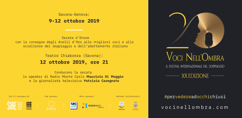 Dopo il lancio alla 76ª Mostra internazionale d’arte cinematografica di Venezia nell’ambito delle Giornate degli Autori, la XX edizione di Voci nell’Ombra – Il Festival internazionale del doppiaggio prosegue il suo cammino tra Genova e Savona, dove si tiene dal 9 al 12 ottobre 2019. Al centro della scena ci sono i doppiatori, gli adattatori e tutti i professionisti che stanno nell’ombra dell’industria cinematografica italiana, considerata in questo settore fra le migliori del mondo. Il gran finale con le 52 nomination che si sciolgono nel verdetto dei vincitori, chiamati sul palco del Teatro Chiabrera di Savona a ricevere i 18 Anelli d’Oro in palio e i numerosi premi speciali, sarà preceduto da un omaggio al primo direttore del festival Claudio G. Fava, da un incontro dedicato al podcast come fenomeno industriale in crescita, da una proiezione studiata per coinvolgere le scuole, da una tavola rotonda con ospiti internazionali sulla trasposizione multimediale come sfida per rendere accessibili cultura e intrattenimento ai disabili visivi e uditivi. Il ventennale segna un momento storico per il più longevo festival internazionale interamente dedicato al doppiaggio cinetelevisivo e degli audiovisivi.