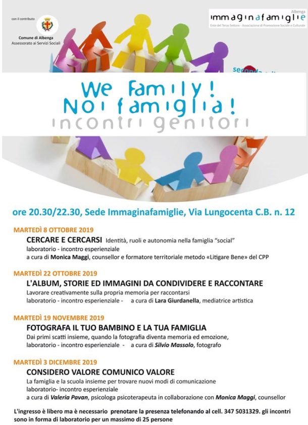 • WE FAMILY! progetto gruppo genitori, quattro incontri tematici presso IMMAGINAFAMIGLIE per massimo 25 genitori ad incontro condotti da professionisti dell’Associazione;
