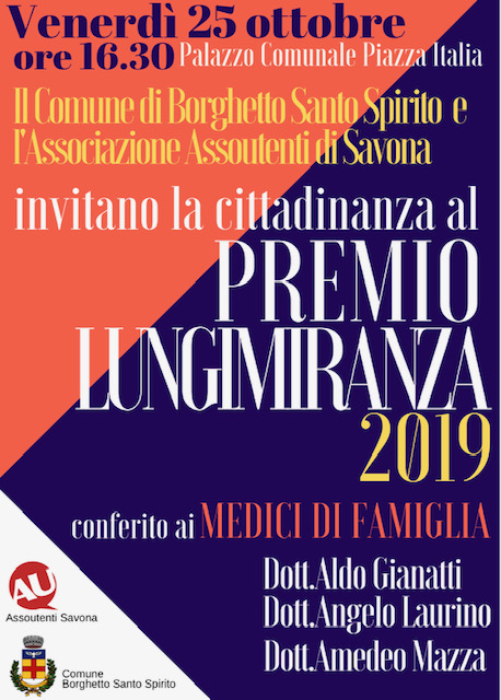 Il medesimo giorno, ma nel pomeriggio, alle ore 16:30, in collaborazione con l’Associazione Assoutenti di Savona, si svolgerà la cerimonia di consegna del premio “LUNGIMIRANZA 2019” conferito ai medici di famiglia che con professionalità ed abnegazione hanno prestato cura ed assistenza sul territorio comunale.