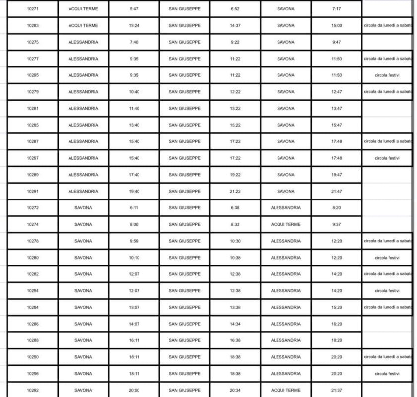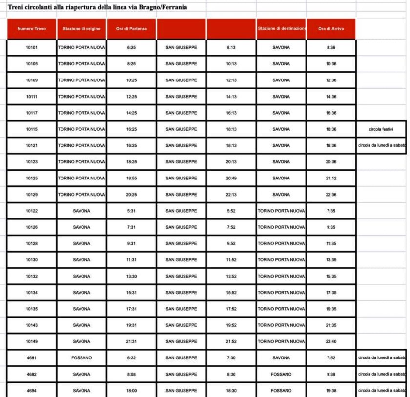 Gianni Berrino, assessore regionale ai Trasporti ha reso noto attraverso un post su Facebook gli orari dei treni della linea valbormidese La prima tabella riguarda i treni che sono attualmente in circolazione, la seconda è la terza invece, rappresentano quelli che riprenderanno a circolare presumibilmente da martedì. Preciso anche che il treno in arrivo a Savona alle 7.53 da oggi avrà una capienza di 900 posti”