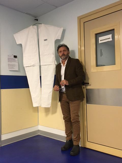 “Ho rappresentato la divisa con un taglio netto, dividendola esattamente a metà per consentire che venga facilmente ricucita con la speranza che alla Sanità torni ad essere riconosciuto il ruolo fondamentale all’interno della Società” è il commento dell’artista.