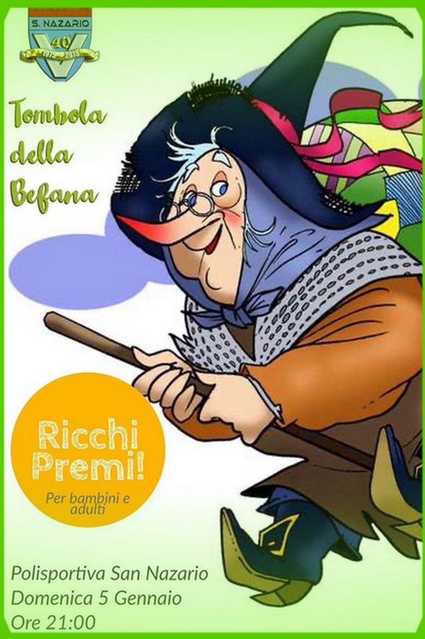 Varazze. Alla Polisportiva S. Nazario di Varazze, anche per quest’anno, si rinnova il tradizionale appuntamento con la “Tombola della Befana“, in programma domenica 5 gennaio 2020, con inizio alle ore 21:00 con ricchi premi per tutti, Bambini e Adulti.