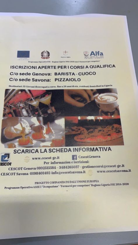 Sono aperte le iscrizioni ai corsi per ottenere la qualifica di barista-cuoco e pizzaiolo nelle sedi Cescot di Genova e Savona. Il corso è rivolto a 15 disoccupati con età non superiore ai 29 anni residenti o domiciliati in Liguria. Il progetto è cofinanziato dall’Unione Europea. La scheda informativa è disponibile su www.cescot-ge.it e www.cescotsavona.it
