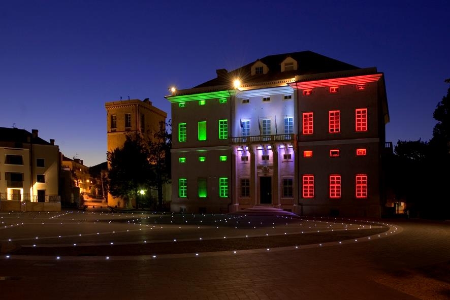 simbolicamente il tricolore su un monumento caratteristico della città attraverso un gioco di luci bianche,