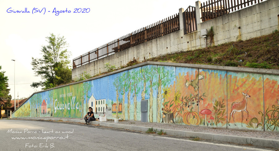 Da qualche giorno a Giusvalla può contare su un’oasi verde in più. L’artista valbormidese Monica Porro ha abbellito con un murales il centro cittadino della splendida località dell’entroterra savonese. Tra il ristorante “Cavallo Bianco” e le famose file di acacie che contornano la strada, un grosso muro di contenimento composto da moduli di cemento si è ora trasformato in uno spazio ‘verde’. Il segno di come si possa rendere vivo, attraverso i colori dell’arte, anche un muro anonimo e grigio.