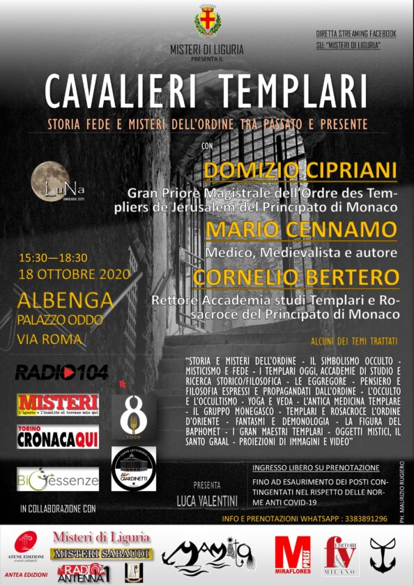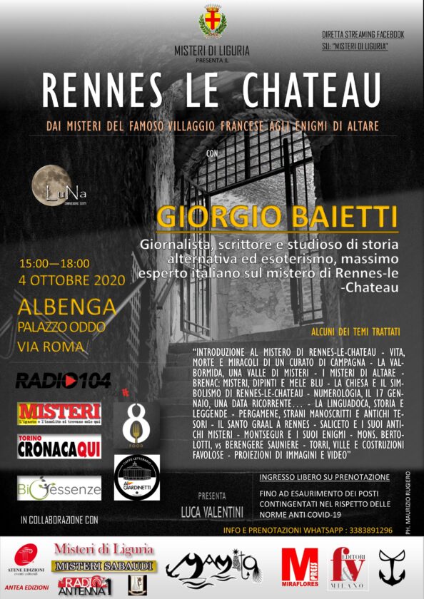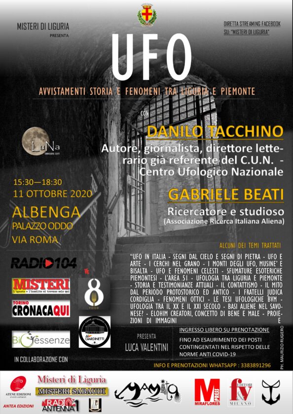 Tutti gli appuntamenti organizzati da LuNa Comunicazione|Eventi, promossi da Misteri di Liguria con il patrocinio del comune di Albenga e presentati da Luca Valentini si sono svolti nella sala quadrata del magnifico Palazzo Oddo, ad Albenga (Sv) nel totale rispetto delle norme anti-Covid e facendo registrare il tutto esaurito molti giorni prima della data indicata per le conferenze che sono state seguite da un vasto pubblico anche online grazie alle dirette streaming predisposte settimanalmente per l’occasione.