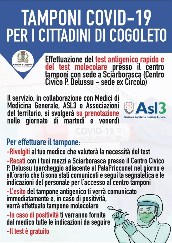 Ecco alcune importanti indicazioni per l’accesso al servizio tamponi Covid-19 che inizierà a Cogoleto da oggi. Il sindaco Paolo Bruzzone, afferma: “A tale proposito, ci tengo a ringraziare sin d’ora i Medici di famiglia e le Associazioni del nostro territorio. Grazie al loro prezioso contributo e alla costante sinergia con Asl3 riusciremo ad offrire alla comunità un servizio importante nel contrasto alla pandemia, con l’obiettivo di tracciare i casi in tempi sempre più rapidi ed evitare il diffondersi del contagio”