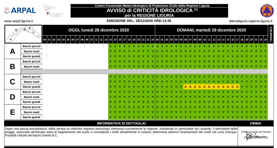 La fase di maltempo invernale che ha interessato la Liguria nelle scorse ore continua a far sentire i suoi effetti sulla nostra regione, prima con la mareggiata che continuerà a crescere per tutta la giornata odierna, poi con la ripresa di precipitazioni che si annunciano diffuse con cumulate significative a levante. La loro azione, combinata all’attuale saturazione del suolo e alla fusione delle nevi, ha portato il Centro Meteo Arpal a emanare una ALLERTA METEO GIALLA sui bacini grandi del levante regionale (zona C), dalle 6 alle 18 di domani, martedì 29 dicembre.