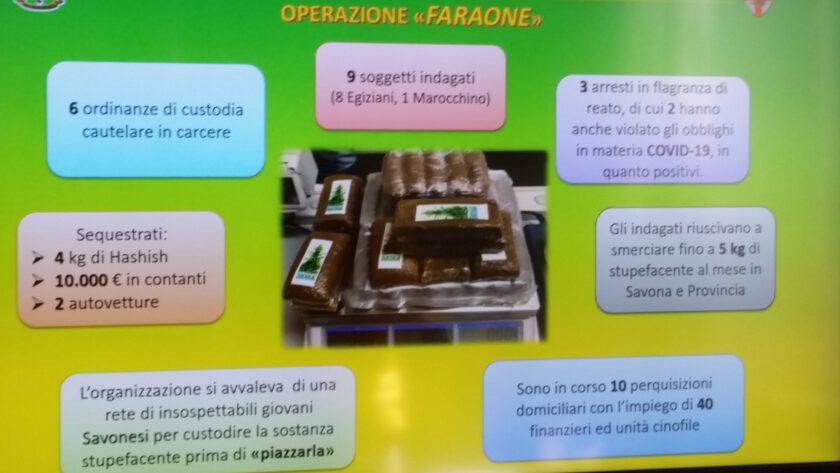Nel corso della mattina i militari del comando provinciale della Guardia di Finanza di Savona stanno dando esecuzione a 6 ordinanze di custodia cautelare in carcere, disposte dal Gip del tribunale di Savona su richiesta della Procura della Repubblica, nei confronti di altrettanti extracomunitari di nazionalità egiziana e marocchina, regolarmente residenti in Liguria e Lombardia e con attività comuni come macellaio, cuoco e altro, per spaccio di sostanze stupefacenti. Gli arresti scaturiscono da un’articolata e complessa attività investigativa condotta dalla compagnia di Savona ed iniziata nel settembre 2020. L’inchiesta si è sviluppata attraverso attività tecniche, affiancate da servizi di osservazione, controllo e pedinamento. Il capo dell’organizzazione, per un periodo di tempo, ha anche diretto l’attività del sodalizio direttamente dall’Egitto. L’attività investigativa svolta ha consentito di accertare che l’organizzazione criminale spacciava tra Savona, Albissola e Varazze fino a 5 kg di hashish al mese rifornendosi nelle piazze di spaccio di Torino. Durante il periodo di lockdown, non potendosi spostare agevolmente oltre i confini della regione, gli spacciatori si approvvigionavano presso Genova ed Albenga.