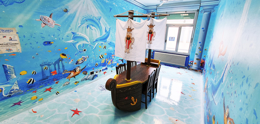 Sono terminati i lavori di trasformazione della sala giochi di Pediatria dell’Ospedale San Paolo di Savona. L’intervento, ideato e curato dall’artista Silvio Irilli, ha trasformato gli spazi in un magico acquario: un coloratissimo pavimento ad effetto fondale marino sul quale galleggia un magnifico tavolo-veliero, fulcro delle attività ludico-ricreative per i piccoli pazienti, ricoverati o in attesa di visita. Il progetto ha inoltre ottenuto il patrocinio della città di Savona che ha permesso l’inserimento dello stemma della città sulle vele del veliero/galeone dedicato ai disegni e ai giochi da tavolo.