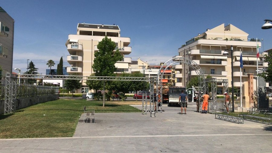 Piazza Enzo Tortora si trasforma in area di manifestazione per la realizzazione di eventi e spettacoli con l’allestimento di un grande palco che rimarrà in loco fino al mese di settembre, americane, impianti luce e strutture di ingresso e uscita dall’area manifestazione.