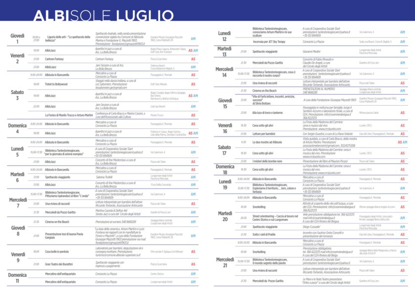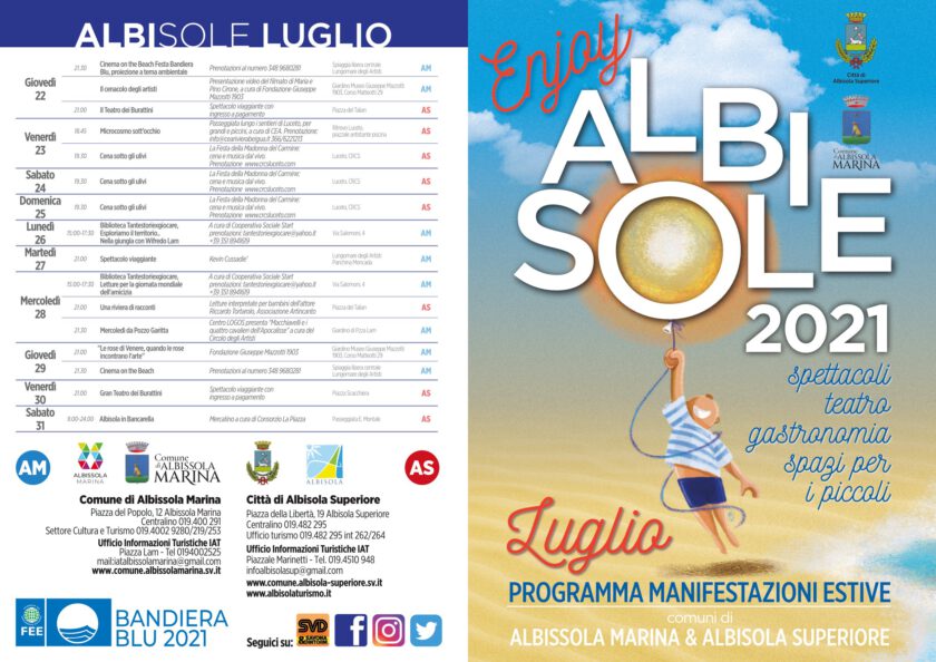 Nel Comune di Albissola Marina tanti appuntamenti fissi per l’estate: tutti i lunedì e mercoledì pomeriggio la Biblioteca Tantestoriexgiocare presenta attività e laboratori per i più piccoli, per giocare, colorare ed imparare divertendosi e, sempre ai bimbi, saranno dedicate le proiezioni del Cinema on The Beach, ogni giovedì sera dei mesi di luglio ed agosto sulla spiaggia antistante Piazza del Popolo (nei pressi del Comune). Dal 7 luglio tornano anche i Mercoledì di Pozzo Garitta, alle ore 21.30 nei giardini di piazza Lam: nel mese di luglio saranno ospiti Martina Cazzola e il suo quartetto jazz, Fabio Rinaudo e Claudio De Angeli, cornamuse e chitarra e gli spettacoli teatrali a cura di “Le mani e le nubi” e “Centro Logos”.