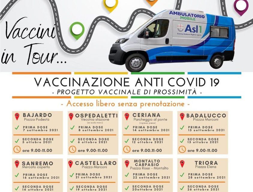 Inizia oggi e prosegue per tutto settembre e ottobre il tour del camper vaccinale della Asl1 nel Distretto Sanitario Sanremese. L’accesso alle vaccinazioni è libero e senza prenotazione. Il calendario prevede già il ritorno del camper nei giorni del richiamo della seconda dose. Martedì 7 settembre: Bajardo, piazza Podesta dalle 9.00 alle 11.00 (seconda dose 5 ottobre). Mercoledì 8 settembre: Ospedaletti, area tra scalo merci e Vecchia stazione dalle 9.00 alle 11.00 (seconda dose 6 ottobre)