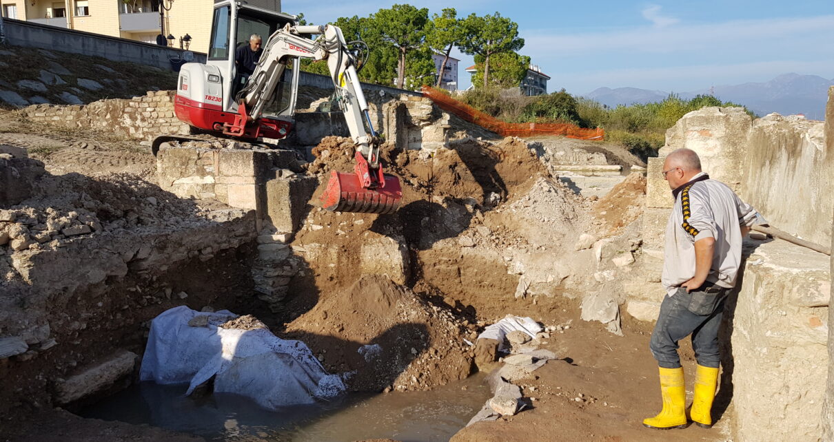 Si sono, infatti, conclusi gli scavi presso l’area: le strutture più profonde messe in luce sono state protette da uno speciale tessuto e si è livellato il terreno in modo tale da ripristinare l’aspetto dei luoghi e poter comprendere appieno le strutture del complesso di culto cristiano che celano quelle delle terme di età romana. Sono stati sette mesi di lavoro intenso che, malgrado tutte le problematiche logistiche, a partire dal livello dell’acqua del fiume costantemente alto, hanno permesso di documentare un’enorme quantità di dati e di effettuare eccezionali scoperte. Le indagini all’interno della chiesa, infatti, hanno svelato l’ormai nota epigrafe di Leoninus uno dei primi ingauni ad essere qui sepolto nel V secolo. Restaurata a tempo di record dalla Soprintendenza, essa verrà ben presto esposta, grazie al contributo del Comune di Albenga, presso il lapidario del Civico Museo Ingauno nella sede dello IAT, rappresentando un esempio virtuoso di restituzione alla cittadinanza del proprio patrimonio storico.