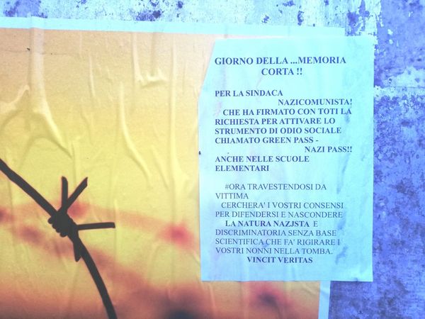 Volantini no green pass sono stato attaccati a Rossiglione sopra alcuni manifesti che ricordavano il Giorno della Memoria in segno di attacco contro la Sindaco Katia Piccardo e il green pass. “Per la sindaca Nazicomunista che ha firmato con Toti la richiesta per attivare lo strumento di odio sociale chiamato green pass anche nelle scuole elementari. Ora travestendosi da vittima cercherà i vostri consensi per difendere e nascondere la natura nazista e discriminatoria senza base scientifica che fa rigirare i vostri nella tomba”, è il contenuto del volantino che non ha firma.