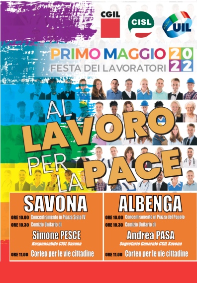 Albenga, Piazza del Popolo ore 10,00 concentramento unitario Cgil Cisl Uil. Comizio unitario: Andre Pasa, segretario generale Cgil Savona