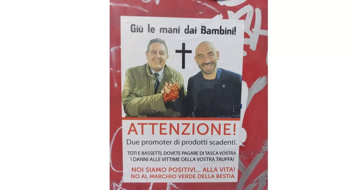 Il presidente della Regione Liguria, Giovanni Toti e l’infettivologo Matteo Bassetti sono ancora finiti nel mirino di contestatori anonimi. I due sono stati raffigurati in un manifesto mentre si stringono la mano, in alto una croce e la frase: “Giù le mani dai bambini” e sotto: Attenzione. Due promoter di prodotti scadenti. Toti e Bassetti dovete pagare di tasca vostra i danni alle vittime della vostra truffa. Noi siamo positivi… alla vita! No al marchio verde della bestia”. In corso le indagini da parte della Polizia.