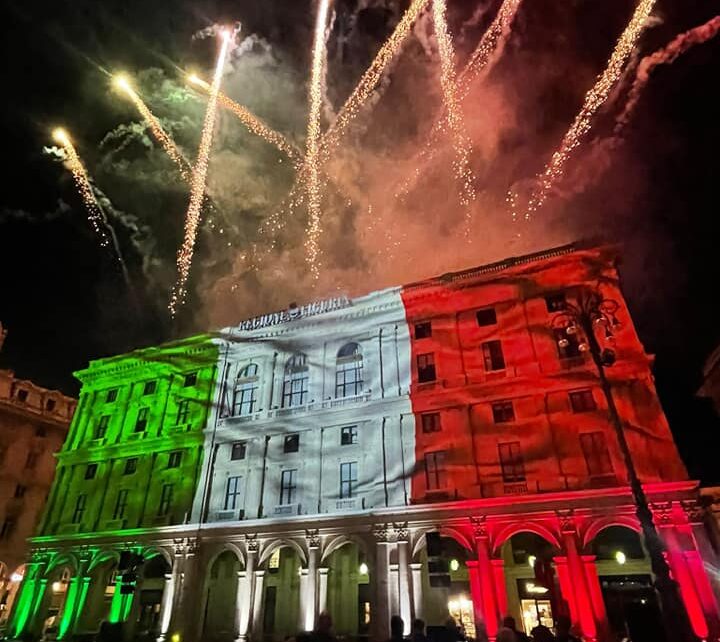 Sulla facciata del palazzo della Regione Liguria, in videomapping, immagini evocative e parti dei testi delle canzoni da cantare e ballare tutti insieme