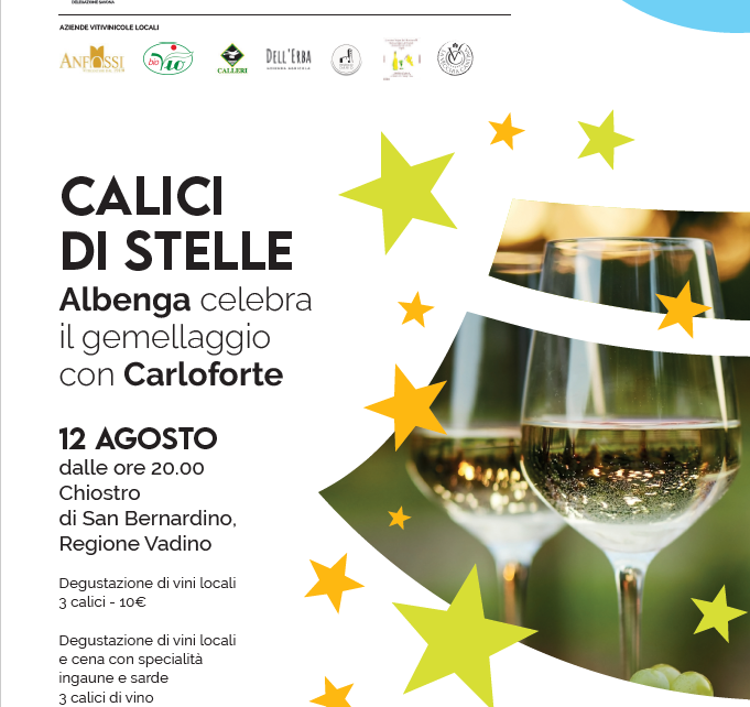 Venerdì 12 agosto “Calici di Stelle” torna ad Albenga e quest’anno celebrerà il gemellaggio con Carloforte con prodotti tipici sardi e un menù tutto da degustare.