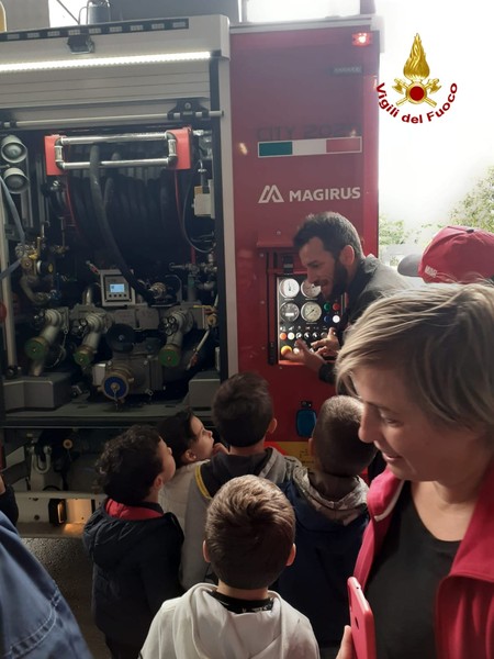 I loro occhi si sono illuminati quando due vigili sono scesi giù per il tubo e hanno acceso la sirena dell’autopompa. Uno dei bimbi ha chiesto al comandante dove mangiano i vigili e come premio i bambini hanno fatto merenda nella mensa della caserma come dei piccoli pompieri.