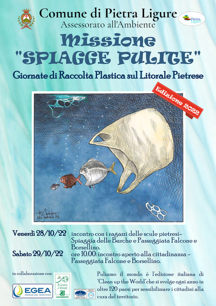 Venerdì 28 e sabato 29 ottobre avrà luogo, sui litorali del “centro” e di “levante”, la 4° edizione di “Missione Spiagge Pulite 2022”, la due giorni dedicata alla raccolta della plastica e, più in generale, alla sensibilizzazione in merito alla raccolta differenziata, ai temi della salvaguardia dell’ambiente e del mare, voluta e organizzata dal Comune di Pietra Ligure all’interno dell’iniziativa “Puliamo il mondo” promossa a livello nazionale da Legambiente.