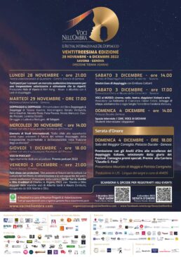 Le voci ci accompagnano per tutta la vita e una volta l’anno sono celebrate dal Festival internazionale del doppiaggio “Voci nell’ombra”, che premia le eccellenze del doppiaggio nel cinema, nella televisione, nei prodotti audiovisivi e non solo. La manifestazione, organizzata dall’Associazione culturale Risorse – Progetti & Valorizzazione, ha la direzione di Tiziana Voarino e è arrivata alla XXIII edizione che si terràdal 28 novembre al 4 dicembre2022 fra Savona e Genova. È stata la prima operazione italiana a valorizzare le professioni e le eccellenze di un settore in cui la nostra nazione è riconosciuta come un modello. Con gli oltre trecento premi consegnati ha contribuito a fare scoprire chi sono le voci nell’ombra, le controfigure italiane delle star di Hollywood, professionisti in grado di stimolare l’immaginazione del pubblico con l’elemento più impalpabile che esista: la voce.«Avete presente le imprese di Maverick nell’ultimo Top Gun? Anche noi – dichiara Tiziana Voarino, direttrice del Festival “Voci nell’ombra” – a volte pensiamo di non farcela, ma con soluzioni determinate troviamo il modo di risalire e dare alla cloche di guida la direzione e la forza necessaria. Possiamo contare sull’originalità dell’idea e del format perché sono ventitré anni, e ancora oltre, che il nostro Festival è nato: cresce e si evolve senza paure, getta semi, con attenzione e con cura, senza presunzione e senza denigrare, portando avanti il messaggio dell’eccellenza, della qualità, della crescita, del miglioramento, dell’accessibilità, dell’oggettività, puntando su una grande rete di collaborazioni, che per questa ventitreesima edizione sono circa centoventi con un proficuo scambio di energie tra il territorio e il panorama nazionale e internazionale».