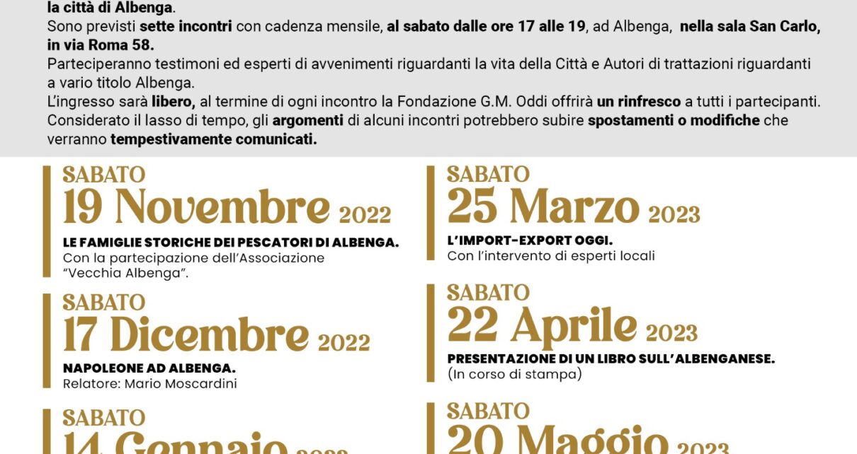 La Fondazione G.M. Oddi organizza, con il Patrocinio del Comune di Albenga, con la collaborazione del prof. Mario Moscardini, la rassegna “Albenga Passato e Presente”: una serie di conferenze, presentazioni di libri o tesi di Laurea sulla storia e le attività socio-economiche che hanno caratterizzato e caratterizzano la città di Albenga.