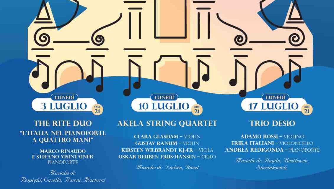 Si comincerà lunedì 3 luglio con The Rite Duo nel concerto “L’Italia nel pianoforte a quattro mani”: Marco Rinaudo e Stefano Visintainer eseguiranno brani di Respighi, Casella, Busoni e Marlucci. Il 10 luglio l’Akela String Quartet, formato da Clara Glasdam e Gustav Ranum al violino, Kirsten Wilbrandt Kjaer alla viola e Oskar Reuben Kriss-Hansen al cello, intratterranno il pubblico con le musiche di Nielsen e Ravel.