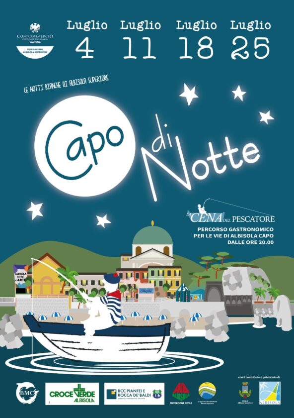 Ritorna Capo di Notte: le notti bianche di Albisola Superiore, che coinvolgeranno il centro storico e la passeggiata E. Montale, per i quattro martedì del mese di luglio.