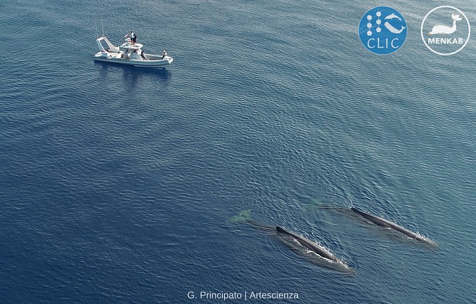 L’emersione simultanea ha permesso di effettuare immediatamente le misurazioni necessarie al calcolo della lunghezza di entrambi gli esemplari. Questo grazie alle fotografie aeree effettuate da Gabriele Principato di Artescienza a bordo di Menkab.