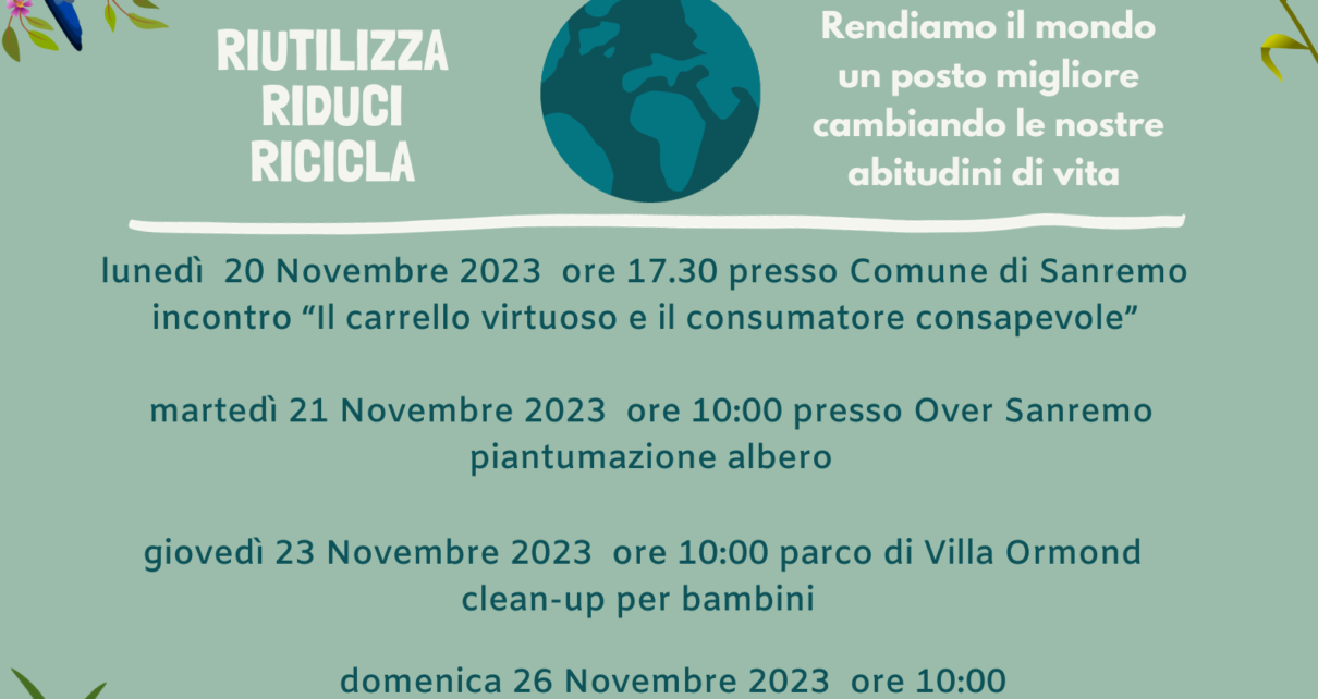 - lunedì 20 novembre, ore 17, Comune di Sanremo, corso Cavallotti (Sala Matrimoni): incontro dal titolo “Il carrello virtuoso ed il consumatore consapevole” (a cura del C.a.v. a.p.s. e I Deplasticati o.d.v.)