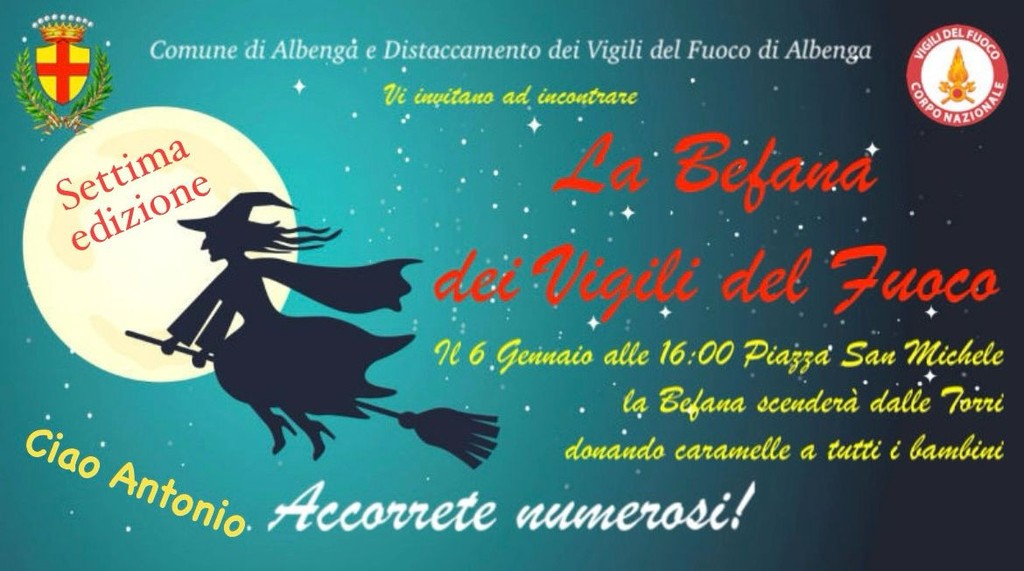 Dalle 16:00, invitata dal Comune ed il Distaccamento dei Vigili del Fuoco di Albenga, la Befana sarà protagonista della settima edizione de “La Befana dei Vigili del Fuoco di Albenga”. Sabato 6 gennaio alle ore 16:00 in Piazza San Michele ad Albenga, la Befana scenderà dalle Torri e donerà caramelle a tutti i bambini che verranno. Questa edizione sarà dedicata ad Antonio Crispino, ex Capo Distaccamento VVF di Albenga e co-fondatore di questa manifestazione a cui stava molto a cuore, purtroppo, recentemente mancato.
