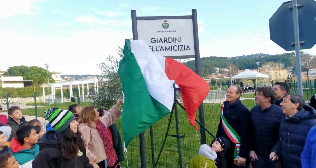 Inaugurato ad Andora il Giardino dell’amicizia, area verde di 2000 mq in via Cavour, con parco giochi per bambini, aree lettura sotto il pergolato e una zona attigua riservata ai cani.