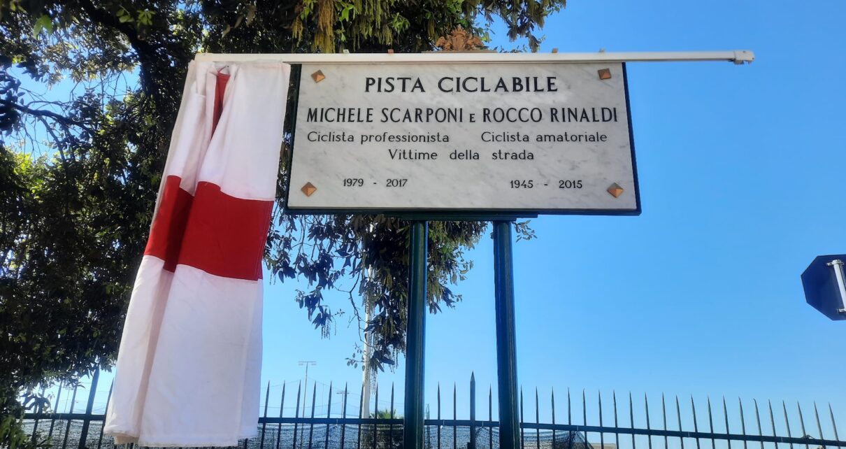 Alla presenza di numerose autorità del mondo istituzionale e dello sport, tra cui il direttore del Giro d’Italia Mauro Vegni, l’ex ciclista Vincenzo Nibali, l’ex CT della Nazionale italiana di ciclismo Davide Cassani e soprattutto Marco Scarponi – fratello di Michele e segretario generale della Fondazione Michele Scarponi Ets – e Luca Rinaldi, figlio di Rocco, in molti tra appassionati di ciclismo e rappresentanti delle associazioni impegnate sul fronte della mobilità ciclabile e sostenibile hanno assistito alla scopertura della targa che, da oggi, potrà essere letta da passanti e frequentatori della pista ciclabile per ricordare il dramma quotidiano delle vittime della violenza stradale.