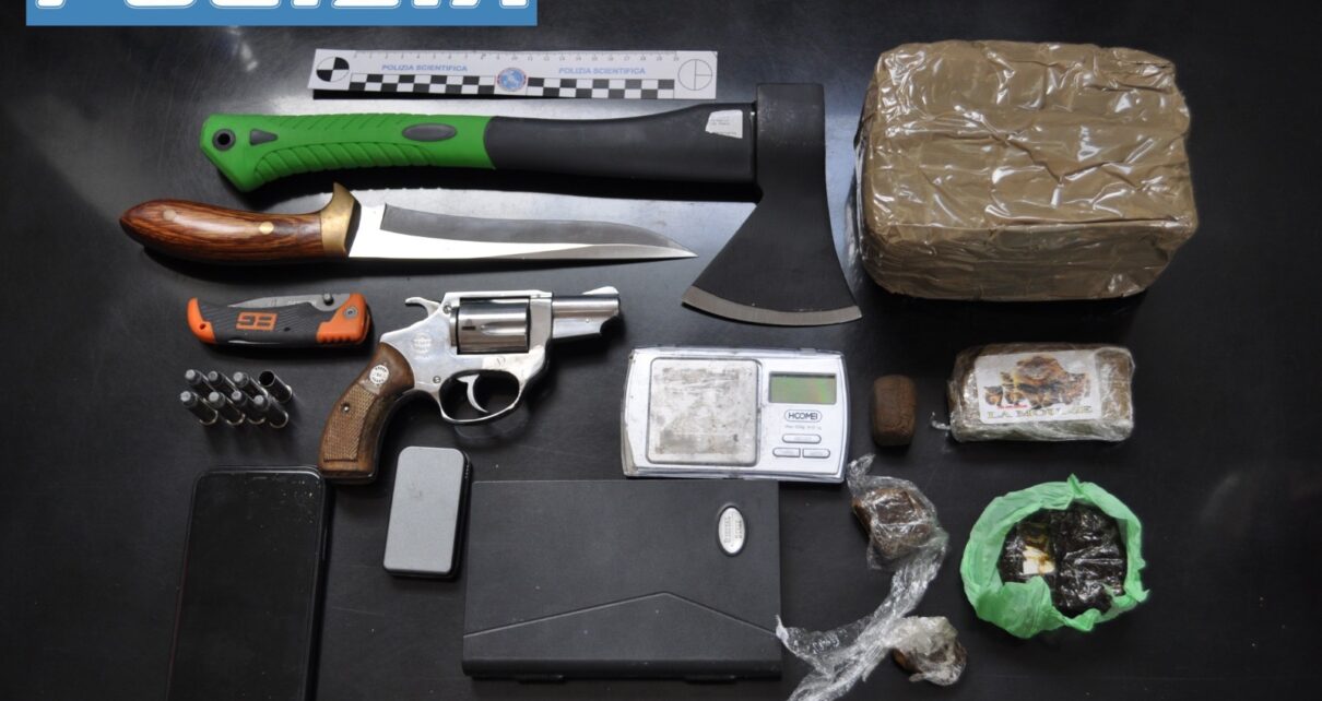 Inoltre sono stati rinvenuti circa 1,3 kg di hashish diviso in panetti da circa 100 gr e materiale utile per il confezionamento di dosi. Sono stati anche rinvenuti un coltello con lama di 20 cm, un coltello a serramanico e un’accetta. Tutto il materiale è stato sequestrato.